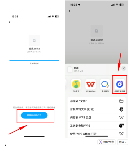 视频加载/下载完毕,点击下方用其他应用打开,选择点盾云方式,即可跳转分享文件至点盾云播放器中。