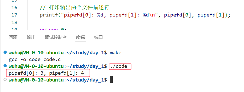 如上,上面的代码,简单使用pipe系统调用创建出了管道文件,接下来,我们编译运行,看看文件的读写端的文件描述符。