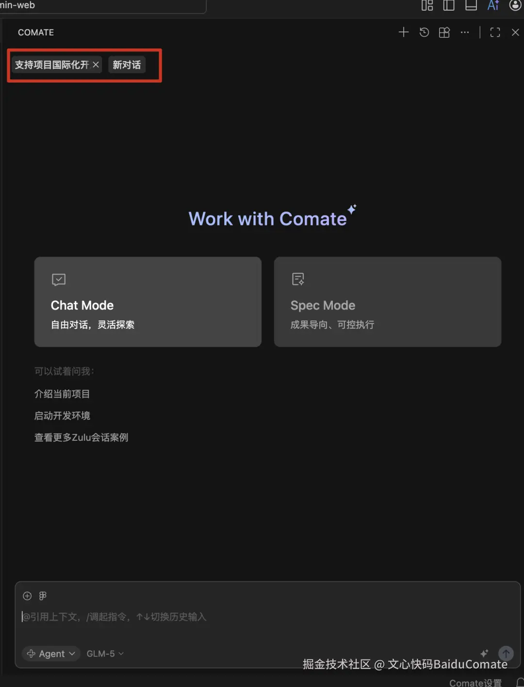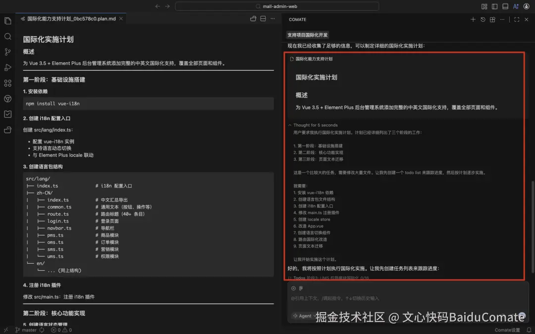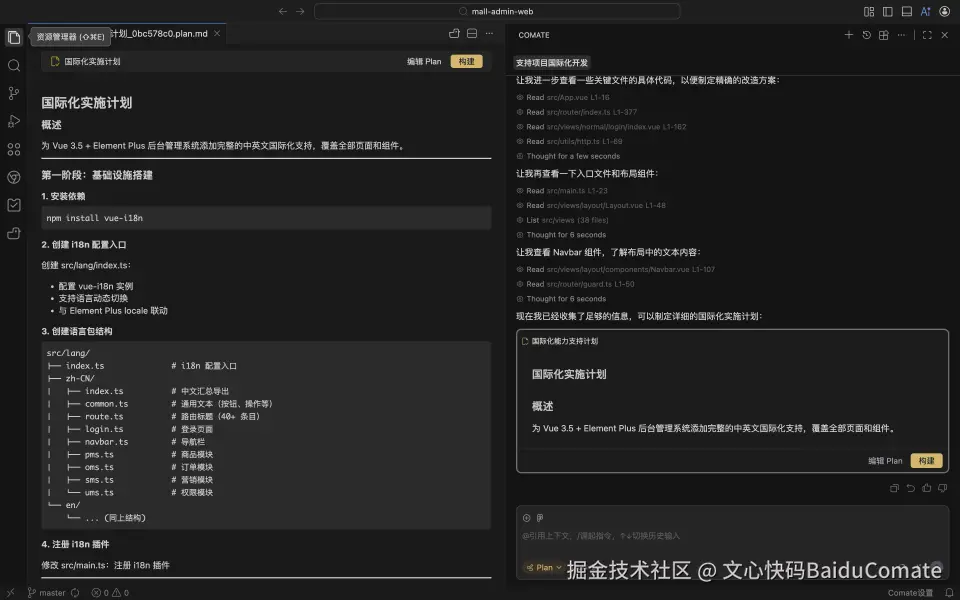 - 操作:向 Comate 发送"为当前项目支持国际化能力",但描述过于简单、未包含完整需求