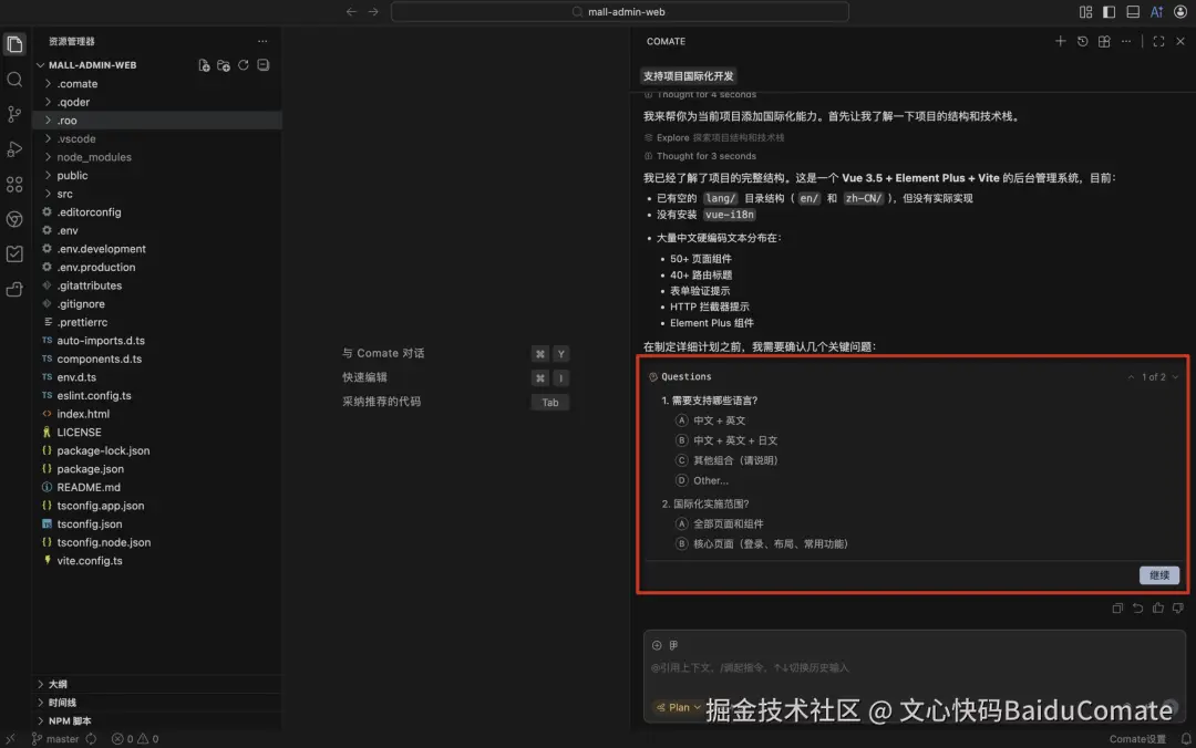在处理复杂需求时,模糊的Prompt往往导致AI生成偏差。Comate全新Plan模式引入了"启发式澄清"机制------Plan模式全面升级,新增执行前先分析输入需求的完整程度,并主动向你提问澄清需求;充分对齐目标后,自动规划任务步骤并生成执行计划,审阅计划后再交付AI执行,生成结果更加符合预期。