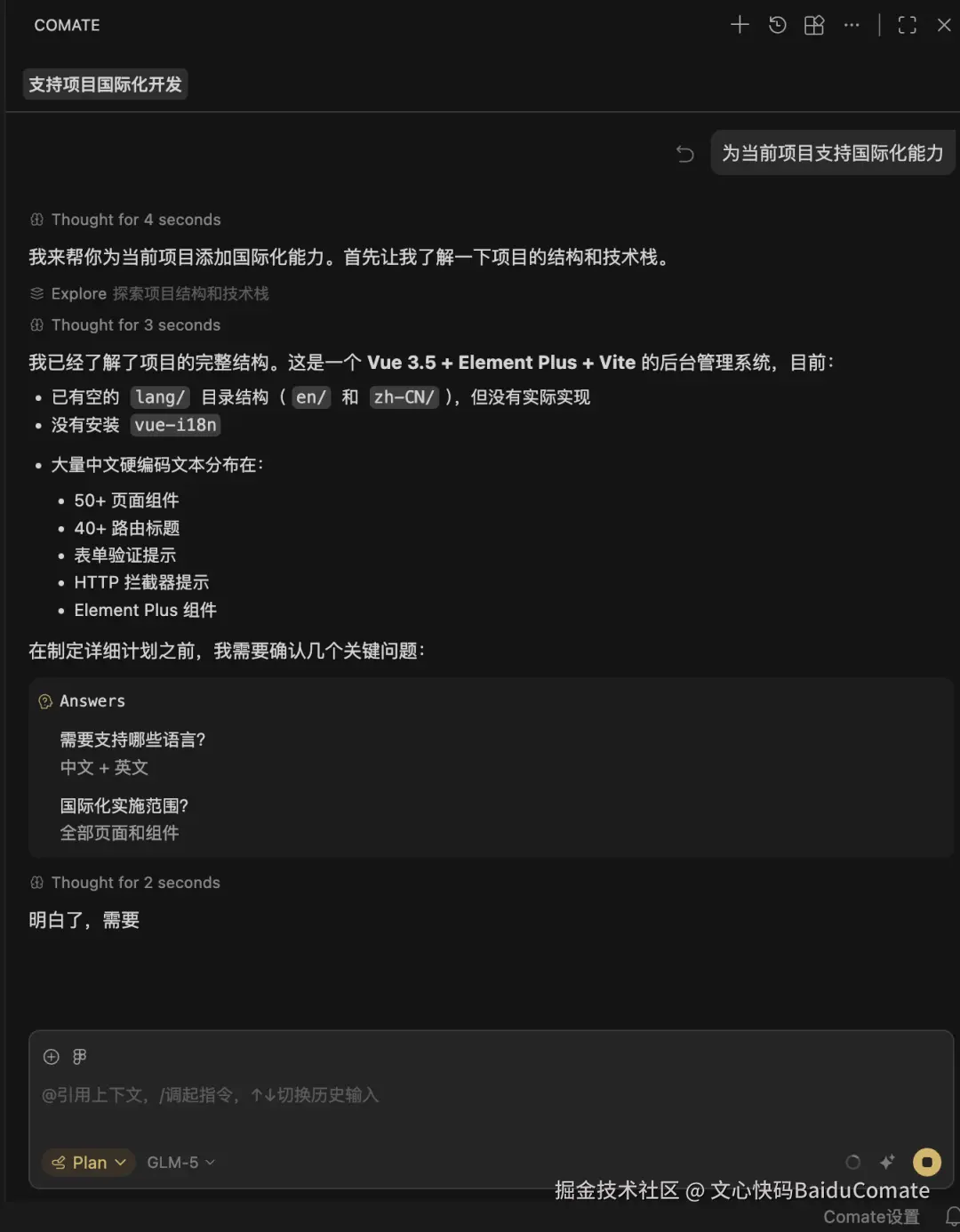 - 效果:Plan 主动询问"需要支持哪些语言?" "国际化实施范围?",根据回答生成完整的任务计划