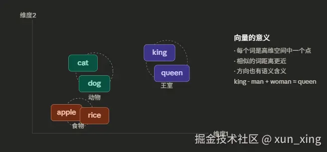 就像地图上的坐标。北京和天津的坐标很接近,北京和纽约的坐标很远。Embedding 就是给每个词在"语义地图"上标一个坐标。
