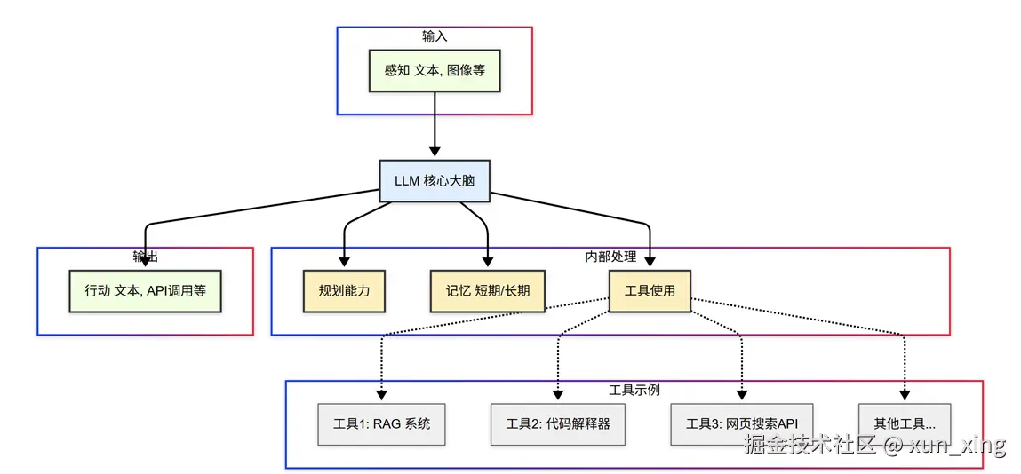 在当前的AI语境下,AI Agent通常以一个强大的LLM作为其核心"大脑",并辅以其他关键组件: