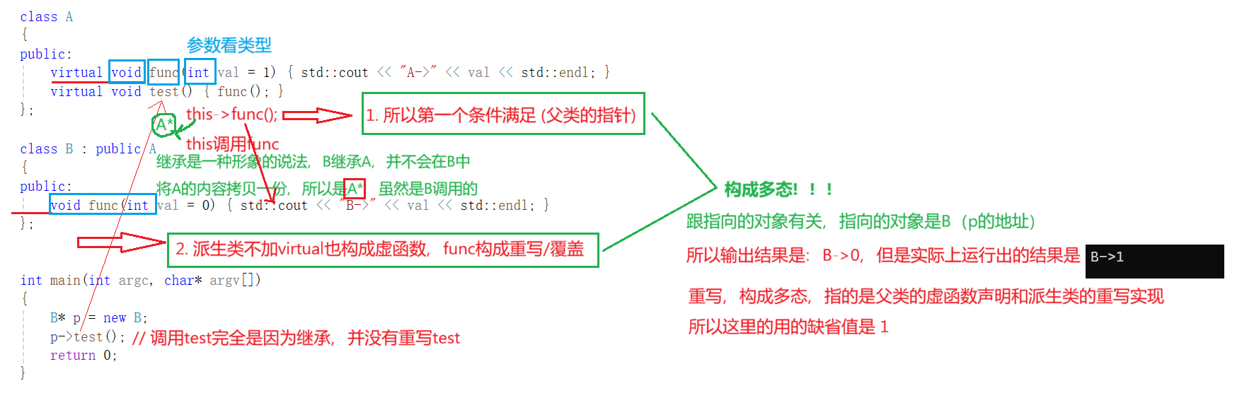 virtual void func(int val = 1) { std::cout << "A->" << val << std::endl; }
