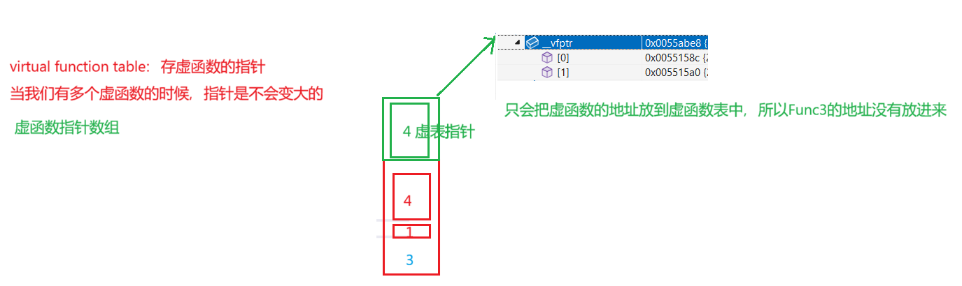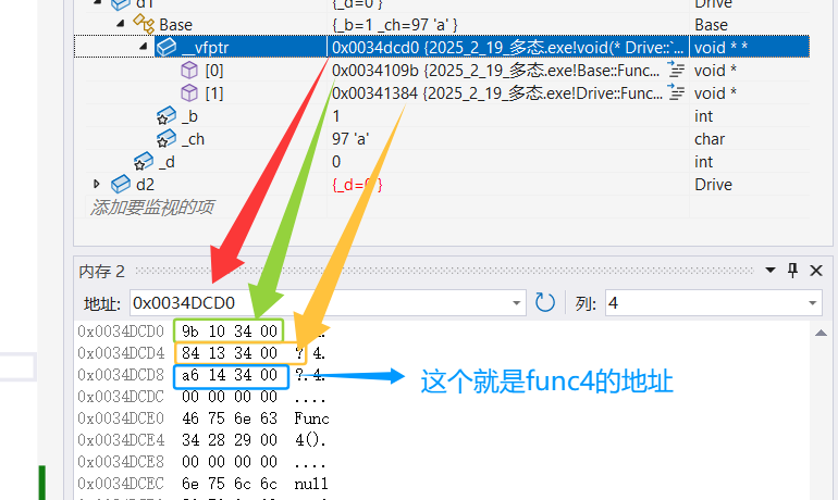 所以说上面的代码应该有3个虚函数,但是监视窗口处理了,没有将Func4()显示出来