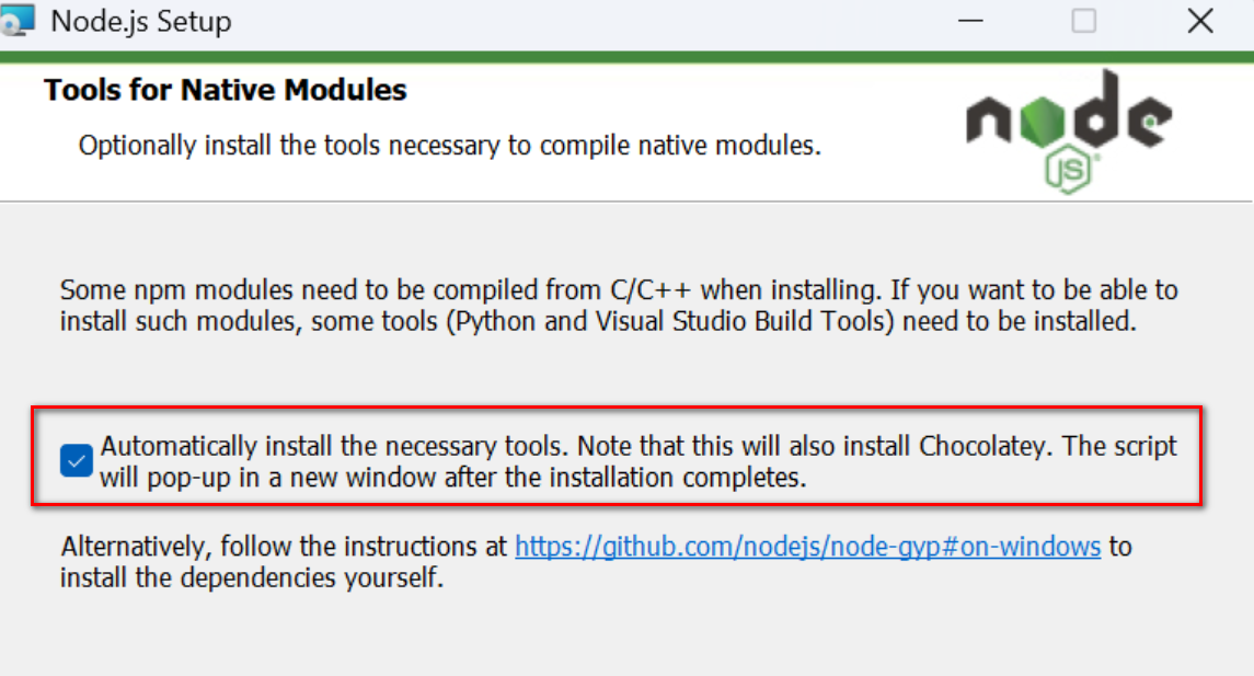 在安装这一块需要注意的是这一块一定要勾选自动安装所需要的依赖工具,在完成nodejs安装后,自动安装这些依赖需要10多分钟。