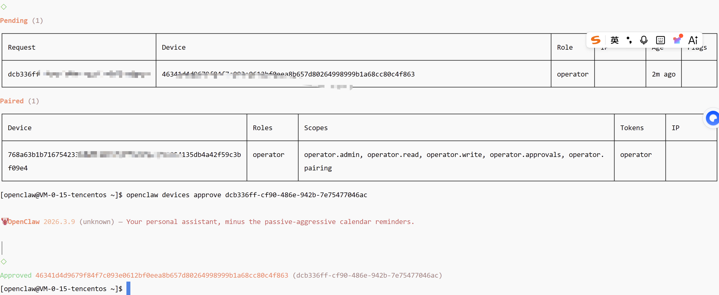 但最简单还是直接用 openclaw 用户执行设备配对。