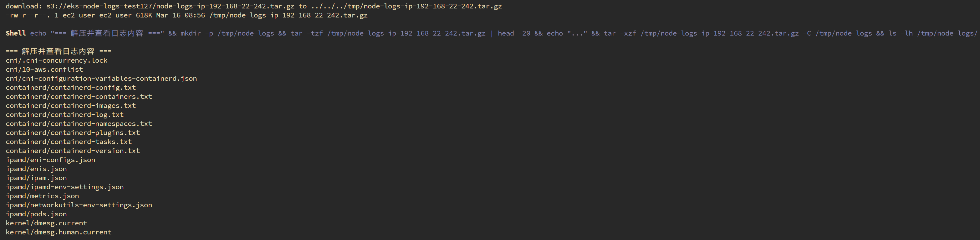 这个日志和通过eks日志收集脚本收集到的内容时相同的,使用这种方式即使无法登录节点也可以收集节点日志,以便于后续的故障排查。