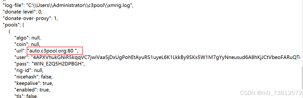 上述各个部分都有提及矿池地址,我们可以找到配置文件:进入 C:\Users\Administrator\c3pool 目录,打开 config.json(xmrig.exe 的配置文件)