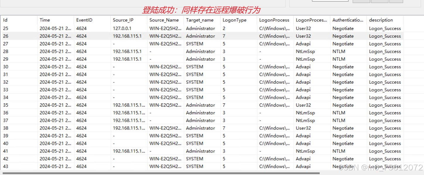 - 受害主机收到来自 192.168.115.131 的 NTLM 远程认证请求 ,使用 administrator 账户,认证失败(4625)。