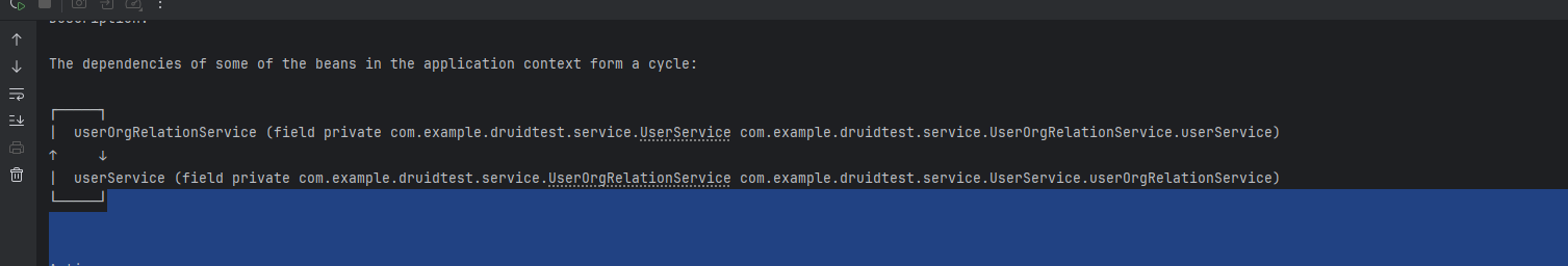 这里UserOrgRelationService依赖了UserService和OrgService,而UserService又依赖了UserOrgRelationService,就产生了循环依赖。