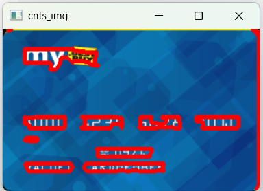 2.5 < ar< 4.0可过滤掉背景轮廓(如银行卡 logo、有效期等); - 尺寸范围筛选进一步缩小目标:排除过小的噪声轮廓和过大的背景轮廓,只保留卡号区域。