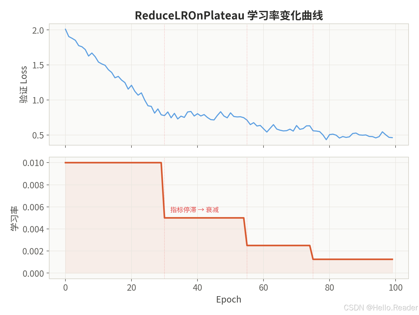 核心思想:监控验证集指标(loss 或 accuracy),当连续 patience 个 epoch 没有改善时,自动将学习率乘以 factor。这是唯一一种"响应式"策略。