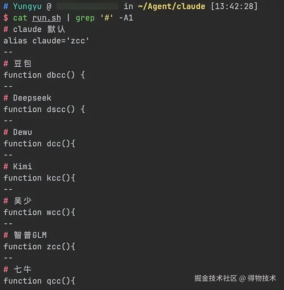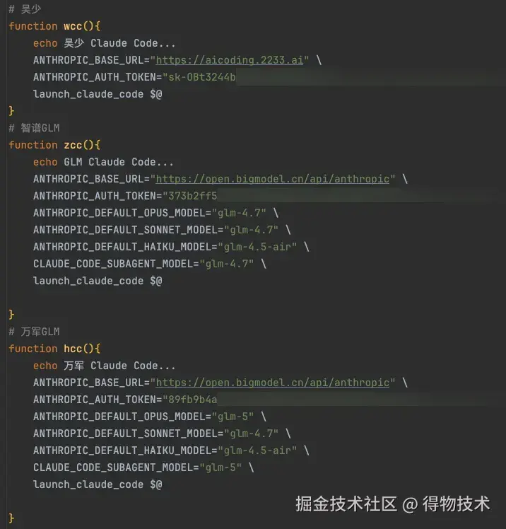 我通过自定义 Shell 函数来实现便捷的模型切换,不同的场景、不同的任务使用不同的模型。基本原理就是,CC 支持环境变量注入 LLM 配置信息,因此我只需要按场景注入【行内临时环境变量】即可。