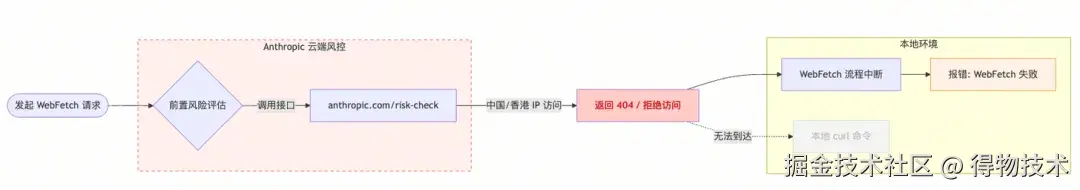 CC 默认集成了 WebFetch 命令,就是指定 URL 读取网页内容,这个理论上就是一个本地执行的 curl 命令,没有云端成本,不需要云端协作。但是有个问题:(一)CC 在访问地址之前,会先调用 anthropic.com 的一个风控接口,判断这个网络地址是否有安全风险。(二)政策原因,anthropic.com 会拒绝所有来自中国大陆、香港的请求,风控接口返回 404 或者其他。(三)风控不通过,WebFetch 失败。
