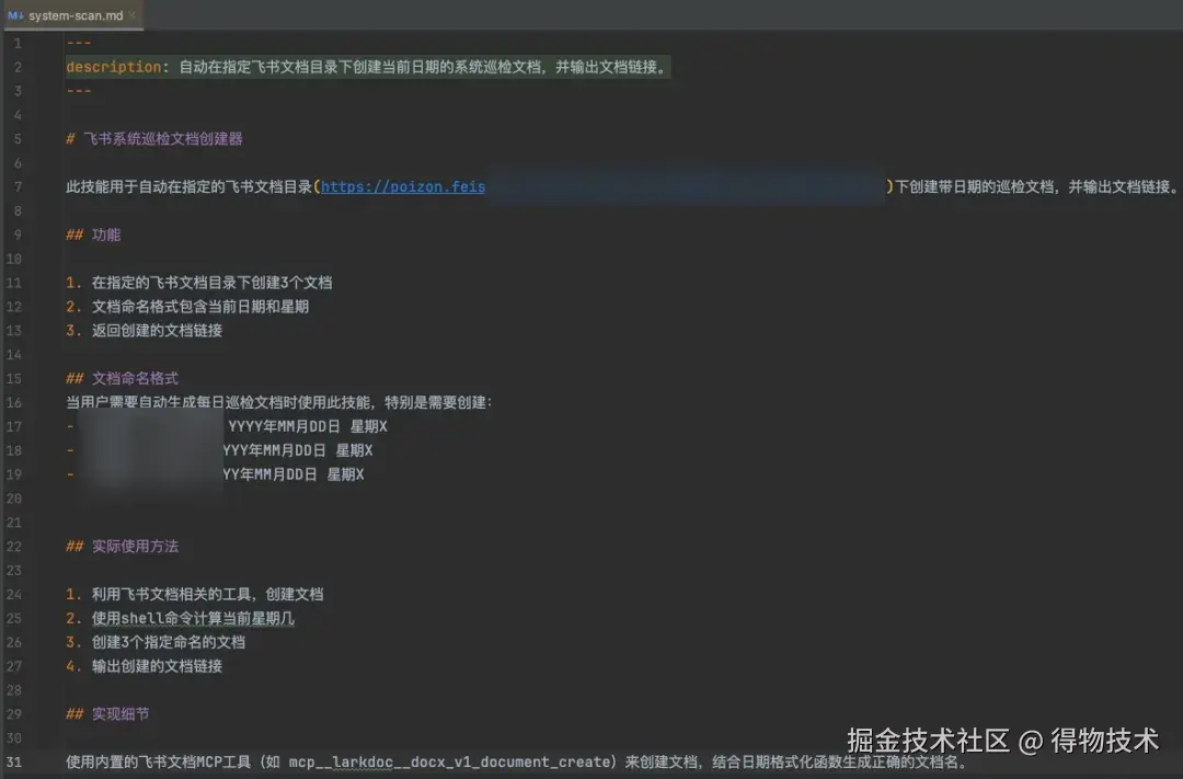 飞书官方提供了 MCP,我主要用它来读写飞书文档,蛮好用的,大家可以试试。比如我每周都要在固定目录下创建固定标题格式的【系统巡检文档】,所以我借助飞书 MCP 整了个自定义 Command 帮我自动创建这些文档去除重复劳动,感觉真香!之前每次都要手动建 3 个文档、选目录、改名字!