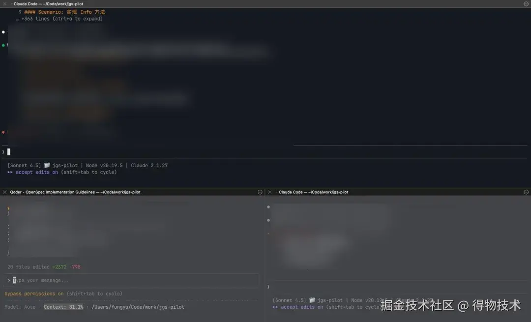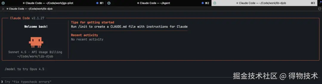 因为我们每个项目都复用一屏内的 3 个子窗口,一般不会重开。为了避免上下文溢出或者之前对话对新任务产生干扰,当我们完成一个任务时,需要及时的执行 /clear 命令,清空上下文,从 0 开始新对话。
