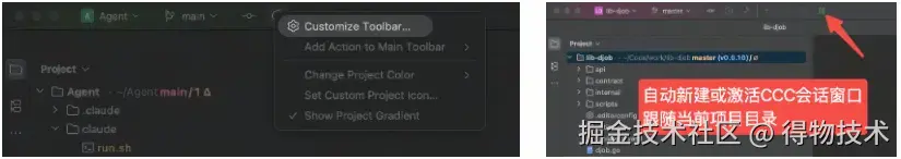 因为某个原因,我在 IDE 里打开了一个项目 A → 准备写代码了,点击 IDE 里的某个【按钮】,左边屏幕自动【新建】一个项目 A 的 CC 会话终端并激活到前台显示 → 我跟左边的 CC 对话,让他干活 → 我在中间的 IDE 里评审、调试、诊断 → 因为某些原因我又要在 IDE 打开一个别的项目 B → 我再次点击那个【按钮】,左边屏幕自动【新建】一个项目 B 的 CC 会话终端并激活到前台显示 → 我在 IDE 里又切回了项目 A,我又点击了那个【按钮】,左边屏幕自动【切换】到 A 的 CC 会话终端并激活到前台显示。