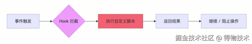 hook 是在特定事件触发时自动执行的脚本,用于自定义工作流、拦截危险操作、自动格式化代码等。就类似 Linux NetFilter,CC 在很多地方植入了流程执行的劫持点,将流程上下文交给用户开发的脚本或者命令。