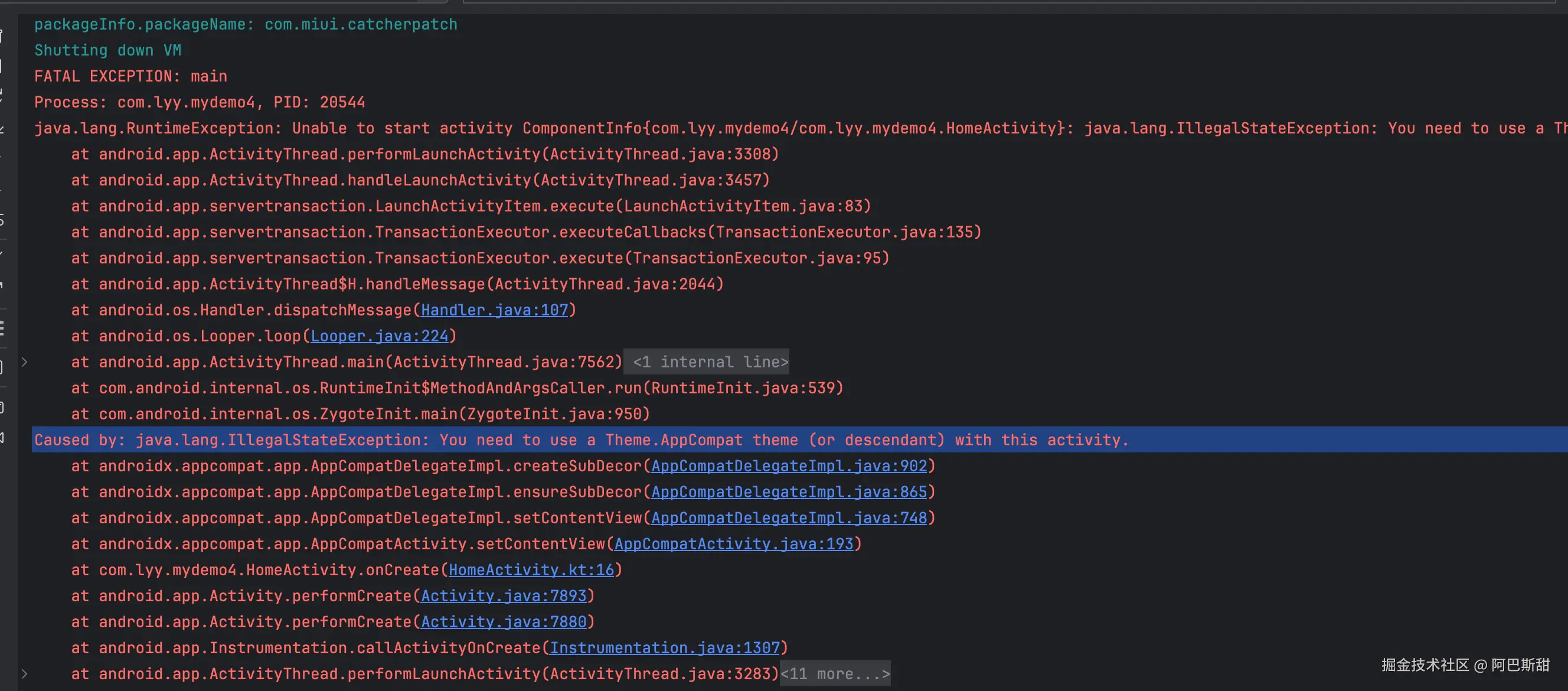 - java.lang.RuntimeException: Unable to start activity ComponentInfo{com.lyy.mydemo4/com.lyy.mydemo4.HomeActivity}: java.lang.IllegalStateException: You need to use a Theme.AppCompat theme (or descendant) with this activity.