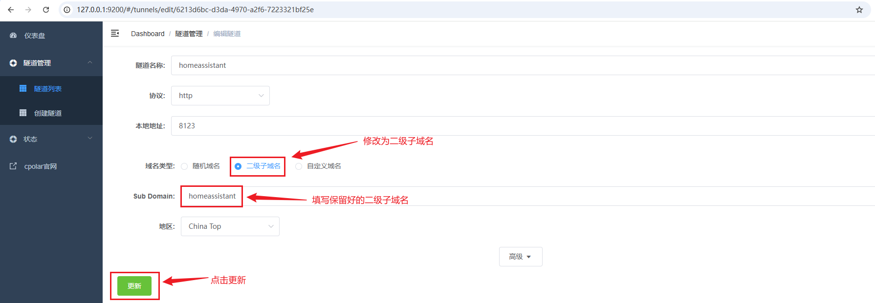 点击编辑website的隧道,这里设置名称为homeassistant方便辨识,然后本地地址填写8123端口系统的访问地址,地区这里选择的China Top,然后点击更新: