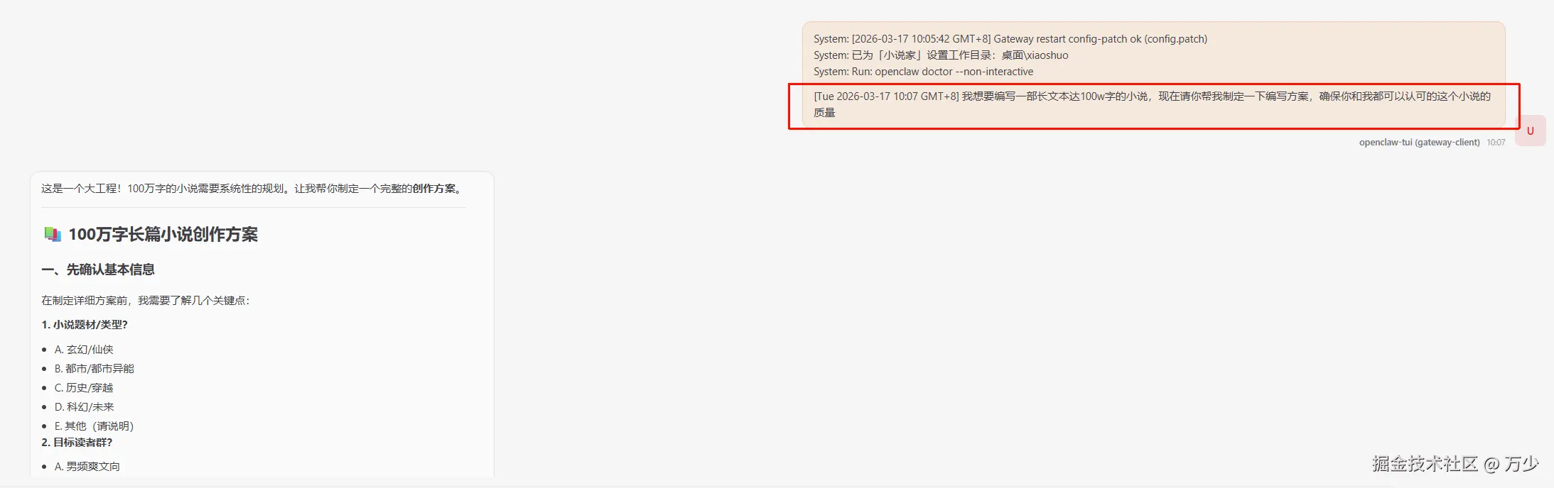 我的龙虾openclaw说要帮我跑15个小时来生成一部100w字的小说