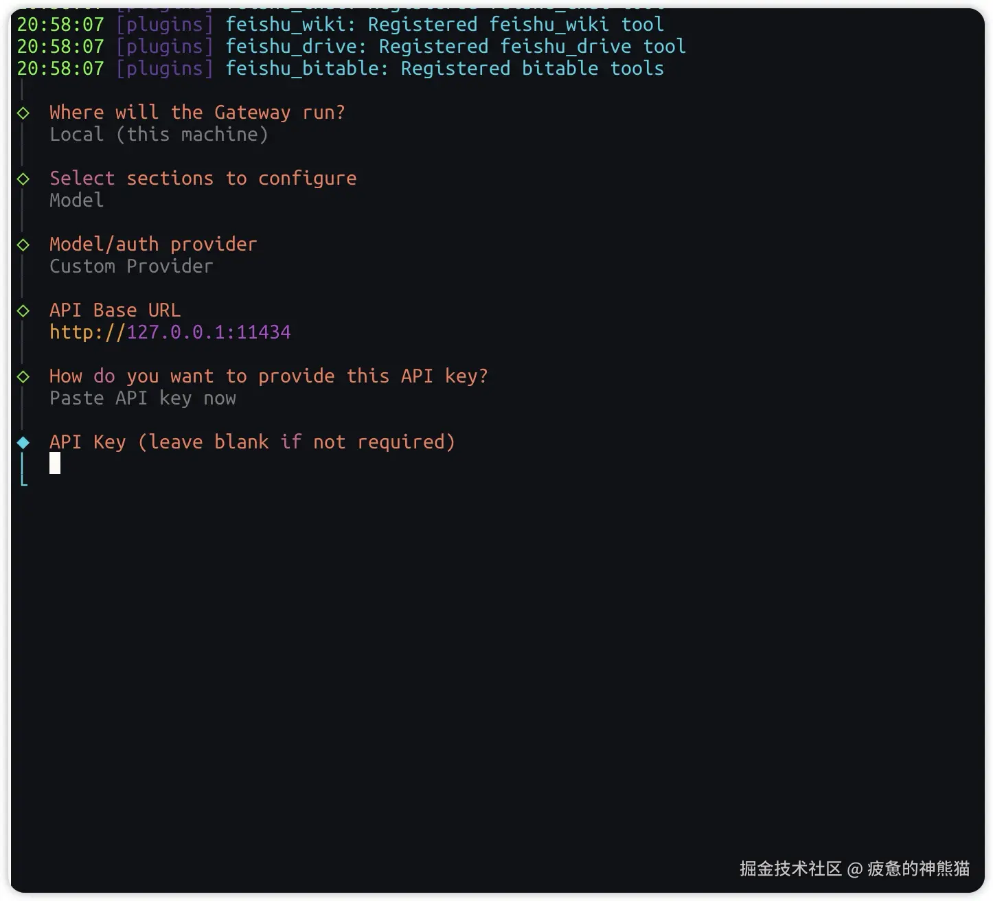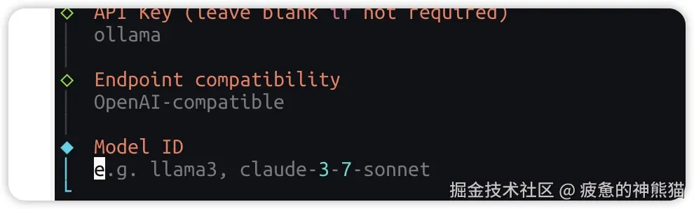 设置APIKEY ,因为我们跑的是本地模型,不存在APIKEY 这里我们直接随便输入或者敲回车略过就行 提示Endpoint compatibility (API端点兼容性设置) 如下图,选择OpenAI-compatible