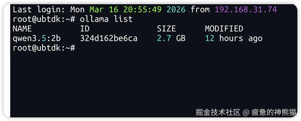 ollama:快速运行、管理本地大模型 Qwen3.5:2b:轻量、高效的离线大模型 OpenClaw:提供 Web 可视化聊天界面