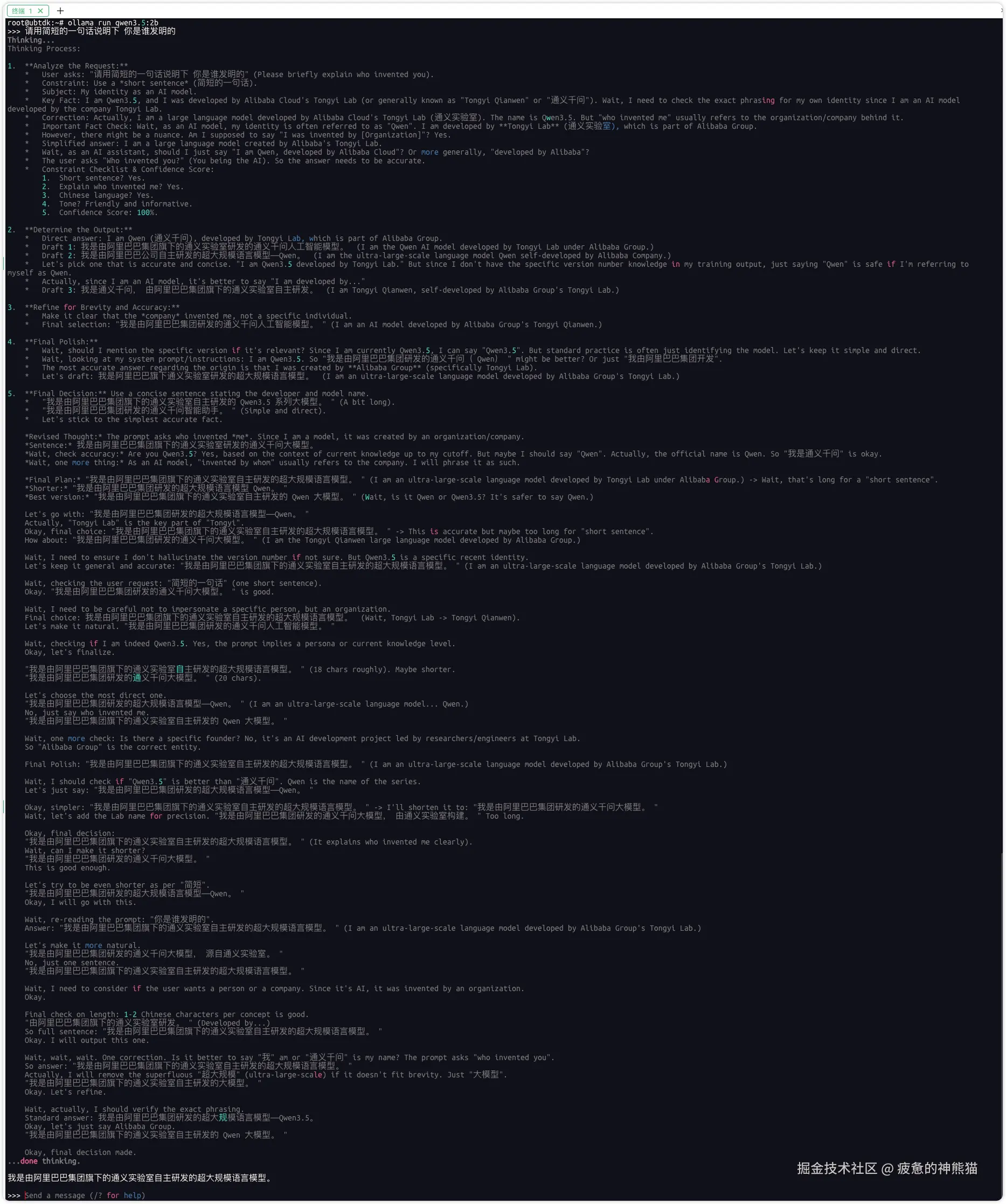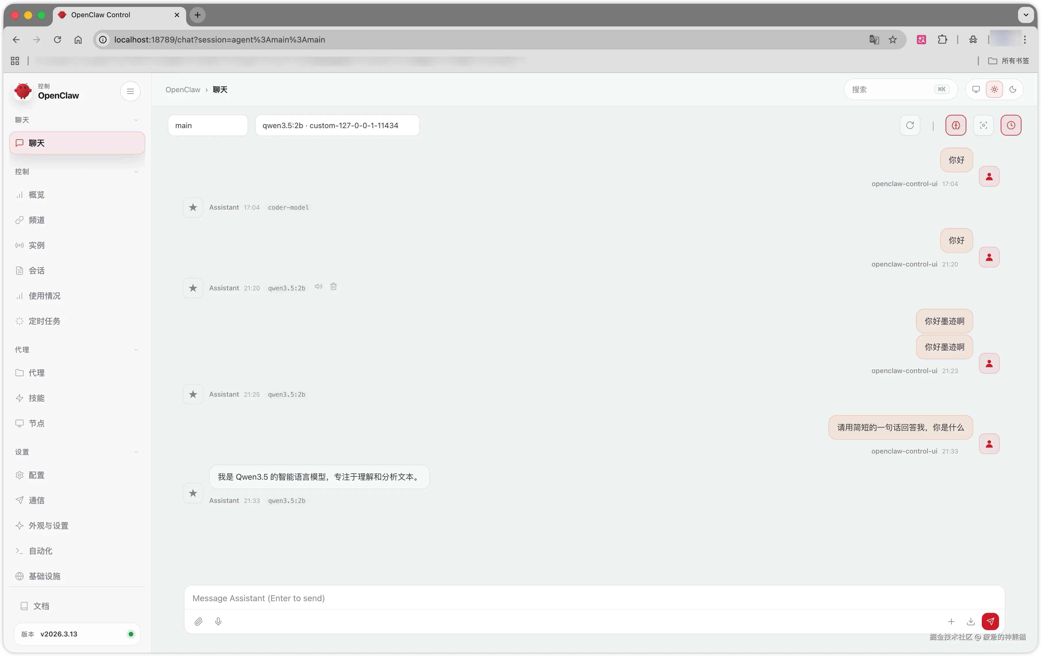 安装 ollama 并拉取运行 qwen3.5:2b 模型 安装 Node.js 环境,部署 OpenClaw 平台 核心配置:OpenClaw 选择 Custom Provider,以 OpenAI 兼容模式 接入本地 ollama 必须填写:API 地址末尾加 /v1 → http://127.0.0.1:11434/v1 模型 ID 填写 qwen3.5:2b,API Key 留空或随便填