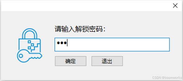*** 关于使用密码保护功能,密码设置一定要记住或者拍照,忘记密码比较麻烦。 设置密码保护之后,在不知道密码的情况下,无法打开和关闭本软件;同时也无法看到主窗口,无法对任务进行增删改操作,会弹出密码窗口(图5-3-3)。结合上一条功能,可以做到开机自动隐藏,即使热键呼出也无法关闭软件。遇到此类无法解决的问题,请联系作者。
