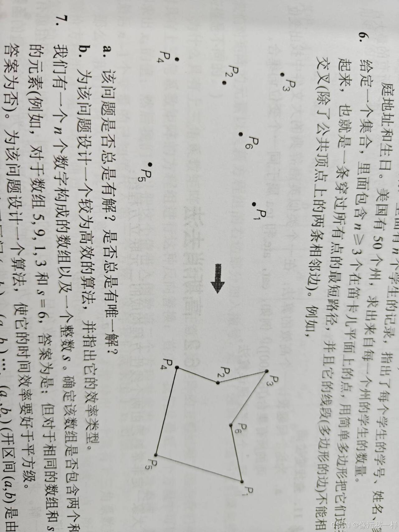 6.给定一个集合,里面包含n≥3个在笛卡儿平面上的点,用简单多边形把它们连接起来,也就是一条穿过所有点的最短路径,并且它的线段(多边形的边)不能相互交叉(除了公共顶点上的两条相邻边)。例如,