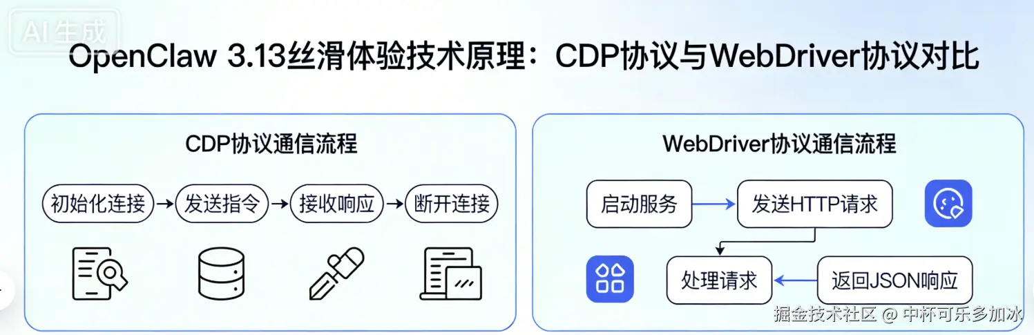 之前用的是WebDriver协议,就像通过中介买东西,一来一回环节多,延迟高。现在直接用Chrome官方的CDP协议,就像厂家直销,省掉中间商,速度自然快。实测响应时间从几百毫秒降到几十毫秒,感知极其明显。