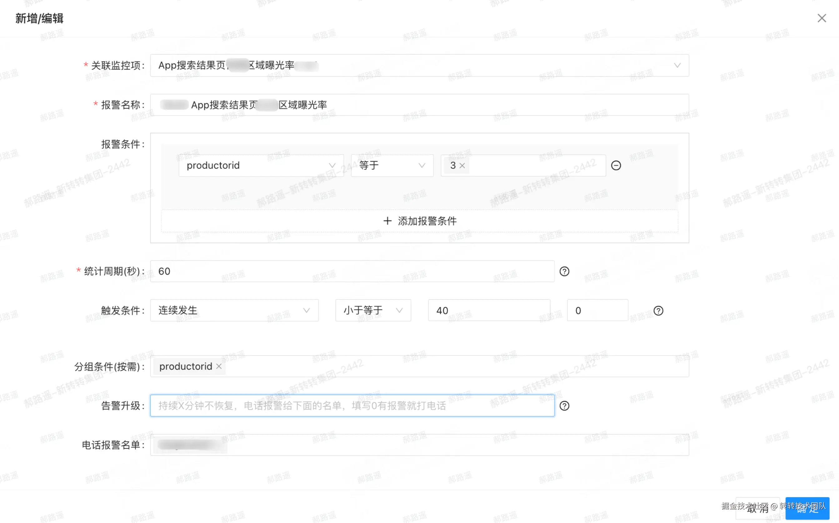 | 报警条件 | 按维度过滤,只对符合条件的数据做统计与触发(如 t值[终端类型]) |