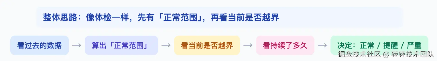 一句话总结: 星盾先用历史数据算出「正常范围」,再拿当前数据和它比;只有偏离够大、持续够久才判定为异常,并根据严重程度给出正常 / 警告 / 严重,从而减少误报、又能及时发现问题。