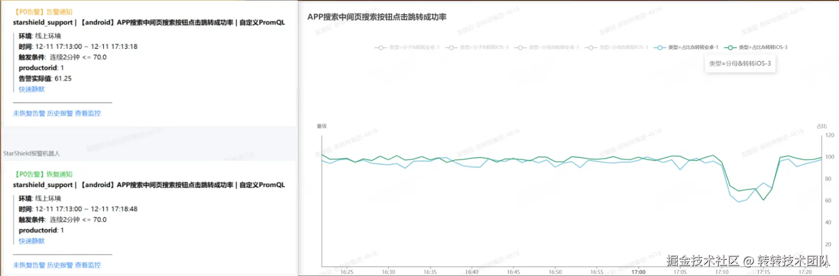 App 搜索结果页短暂进不去时,从图中可以清晰看出 17:10--17:18 左右出现问题并触发告警,方便快速定位与恢复。