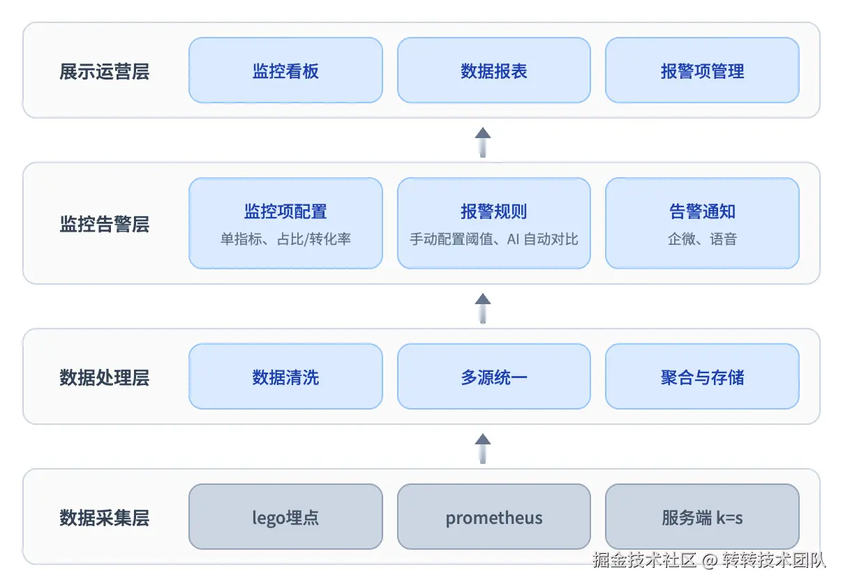 数据采集 → 数据处理 → 监控告警 → 展示运营 ,各司其职,统一收口。