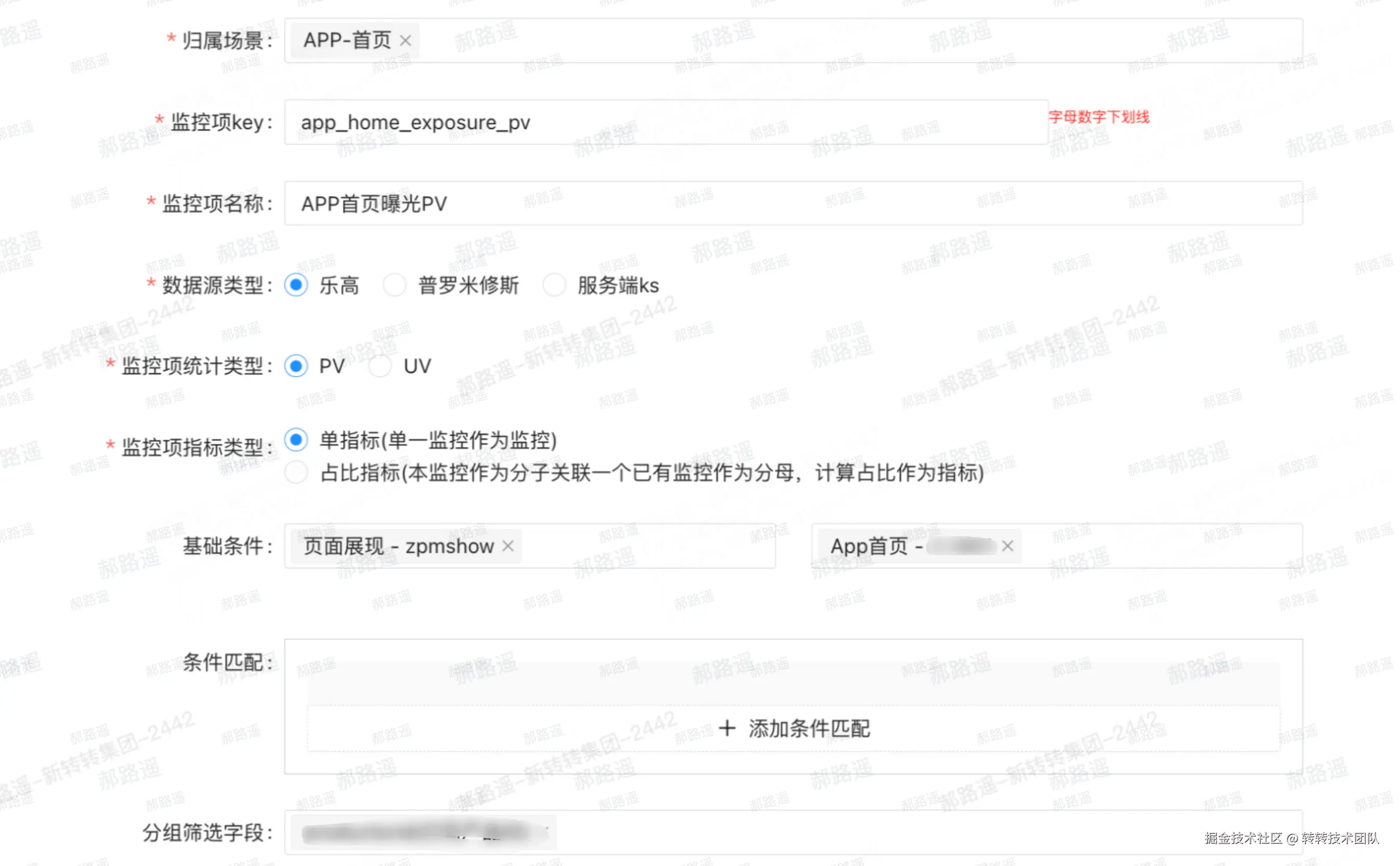 做转化率类报警(如区域曝光 PV / 页面曝光 UV)时,分子分母会分别用到 PV、UV,两种都要支持;占比指标需要在配置时关联一个已有监控项作为分母,系统自动计算占比并报警。