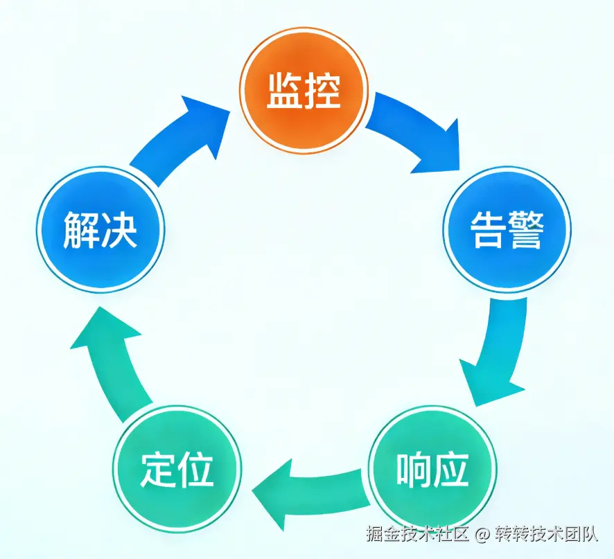 核心逻辑只有十个字:监控 → 告警 → 响应 → 定位 → 解决,形成闭环。