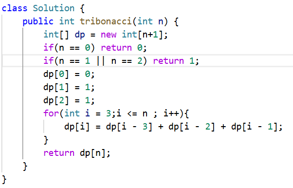 通过动态规划的解题步骤,状态表示为:第i个泰波那契数的值,状态转移方程为:dp[i] = dp[i-3] + dp[i-2] + dp[i-1],初始化为 dp[0] = 0,dp[1] = dp[2] = 1,填表顺序:从下标小的到下标大的(从左向右),返回值:第N个下表对应的值。