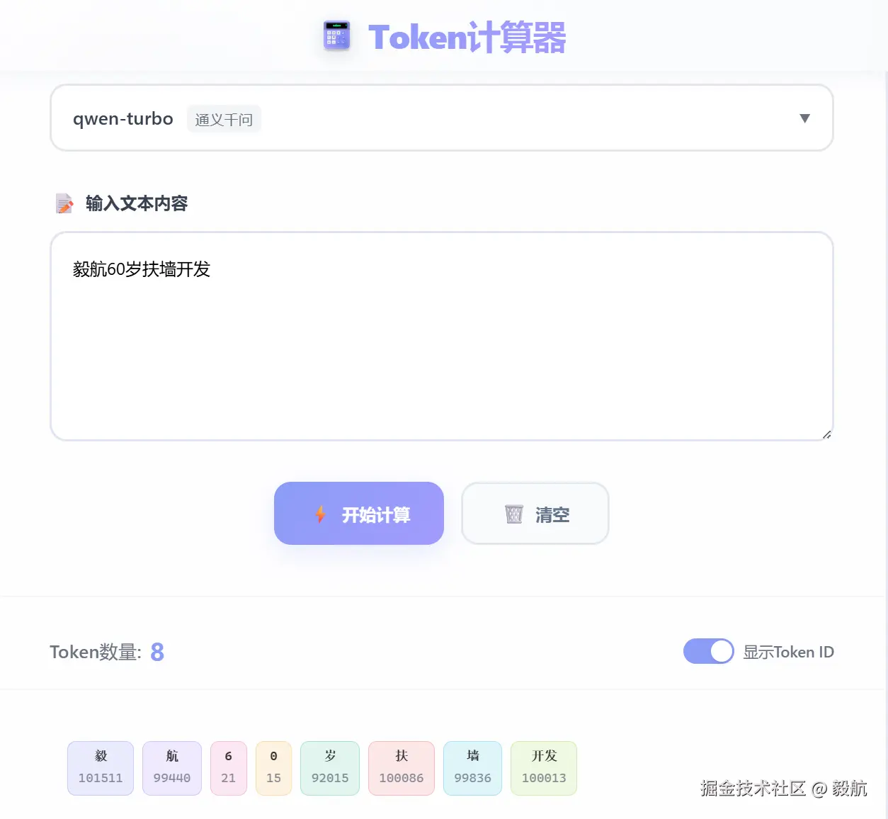 而在AI Tools的Token计算器中,其内容会被切分成 8 个 Token,其中"毅航"会被拆成 "毅" 和 "航" 两个 Token。