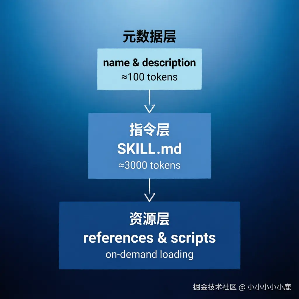 这是 Skills 最精妙的设计------三层加载策略,高效管理宝贵的上下文窗口: