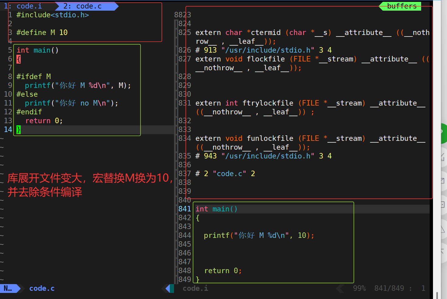 gcc -E code.c -o code.i:开始翻译,在预处理阶段完成后停下来,处理内容放到code.i文件中- 选项
