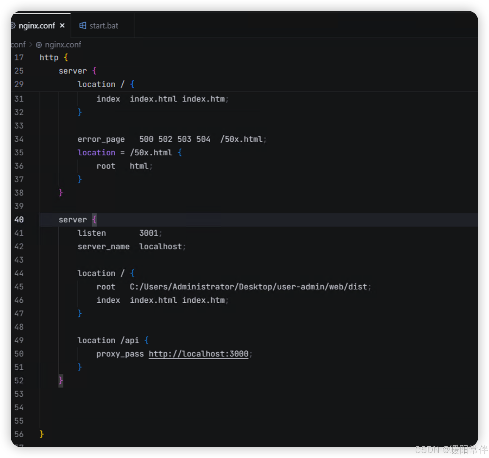 * location /api/:配置反向代理,将对 /api 开头的请求转发给你的Node.js后端服务(例如 http://localhost:3000)。