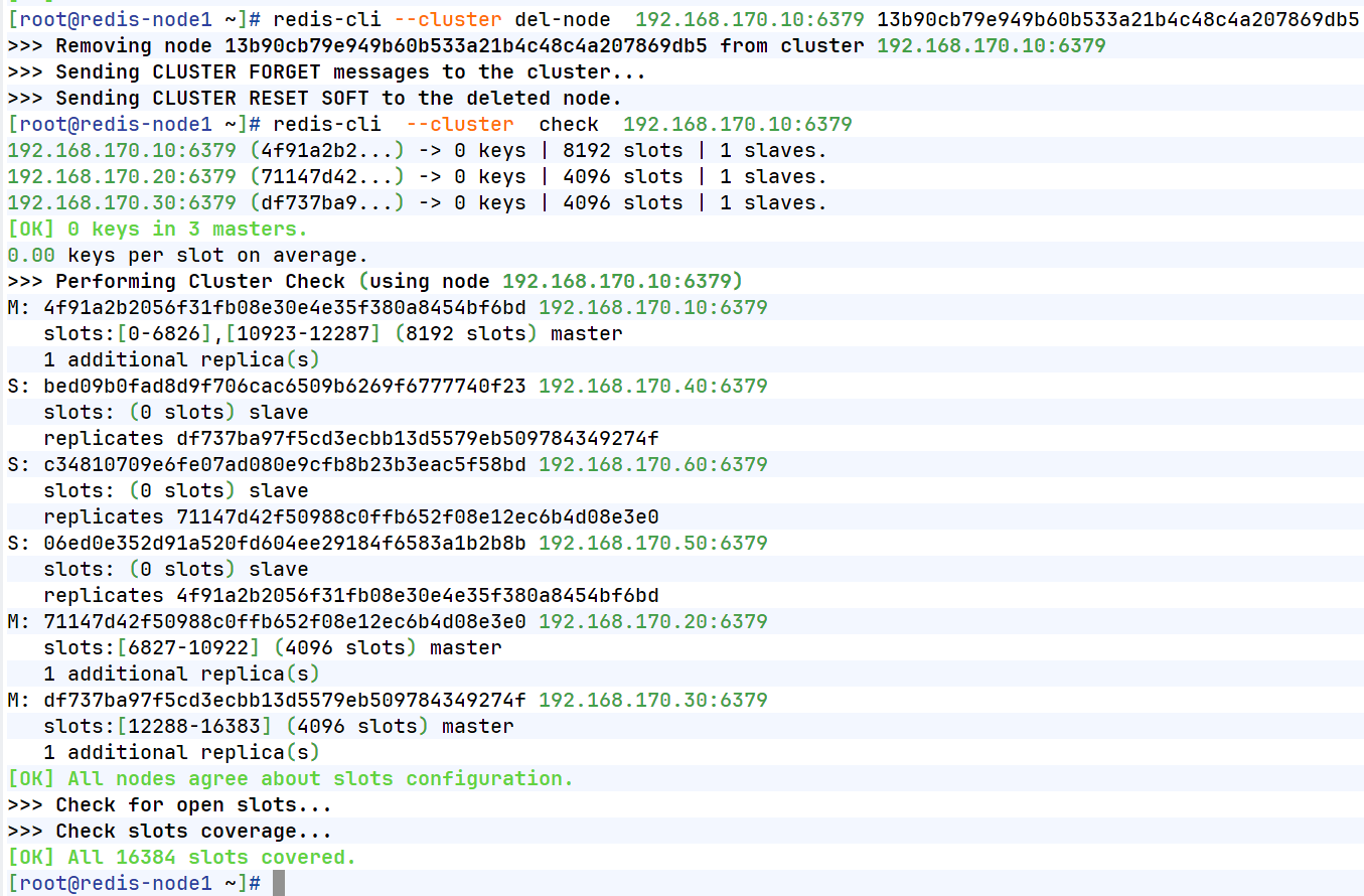 [root@redis-node1 ~]# redis-cli --cluster del-node 192.168.170.10:6379 8dfc87fb4550e288