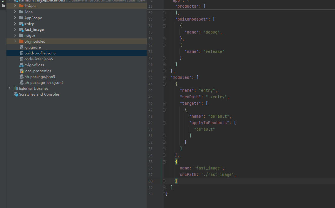 打开 harmony/build-profile.json5,添加以下模块: