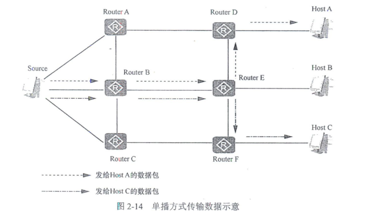 如图2 - 15所示,假设Host A、Host C需要从数据源获取数据,则数据源通过路由器广播该数据,但这时网络中本来不需要接收该数据的Host B也同样接收到该数据,这样不仅信息的安全性得不到保障,而且会造成同一网段中信息泛滥。由此可见,这种传输方式不利于与特定对象进行数据交互,并且浪费了大量的带宽,带来了数据泄露的安全性隐患。