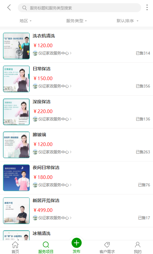 - 支持按地区、服务类型等进行搜索和筛选,还可按默认排序等方式查看服务列表,如洗衣机清洗、日常保洁等具体服务项目,并显示价格、服务商和已售数量。