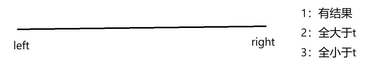left刚开始处于没有结果的不合法区域,right刚开始在合法区域,在上述操作中,right一直在合法区域,left一直想跳出不合法区域,当right等于left时就是最终结果,无需判断。若是情况二,当全部大于t时,right只会向左边移动,直到移动到left和right相遇为止,最终只需要判断是否等于t就行。若是情况三,当全部小于t时,left一直右移,相遇时判断是否为t,相遇时会判断是否为t。这三种情况包含了所有情况,都说明left==right时无需再进循环了,如果判断了就会死循环。2:求中点操作: