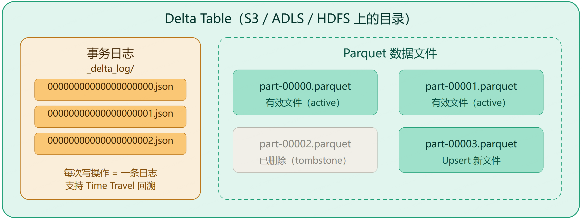 Delta Lake 在 Parquet 上加了一个事务日志(Transaction Log),解决了以上所有问题。